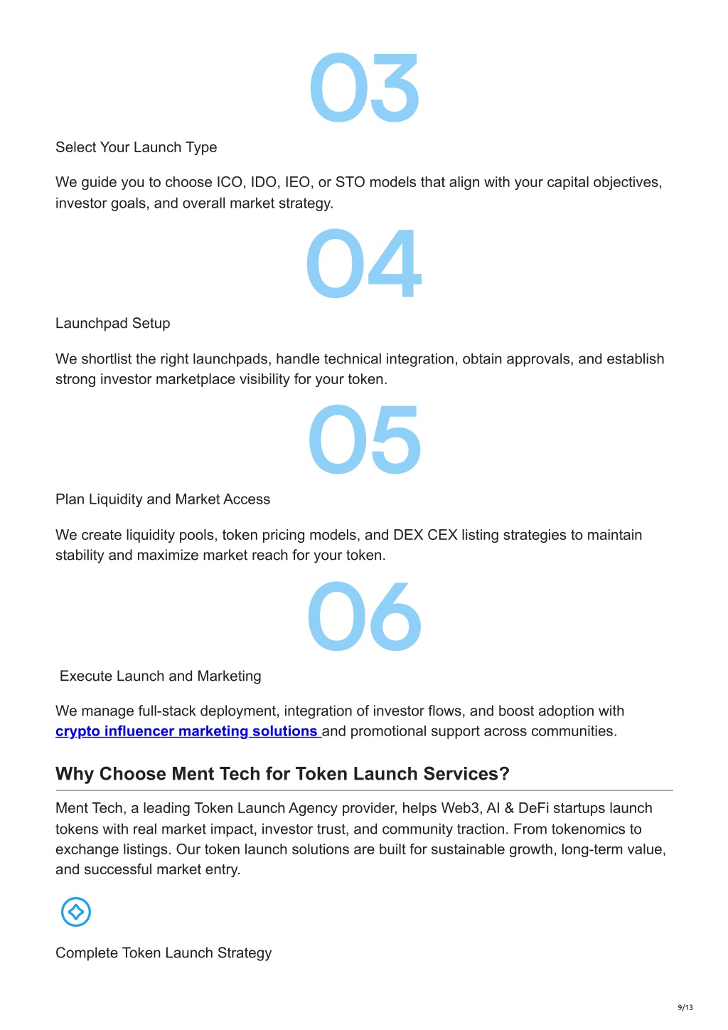 Select Your Launch Type We guide you to choose ICO, IDO, IEO, or STO models that align with your capital objectives, investor goals, and overall market strategy. Launchpad Setup We shortlist the right launchpads, handle technical integration, obtain approvals, and establish strong investor marketplace visibility for your token. Plan Liquidity and Market Access We create liquidity pools, token pricing models, and DEX CEX listing strategies to maintain stability and maximize market reach for your token. Execute Launch and Marketing We manage full-stack deployment, integration of investor flows, and boost adoption with crypto influencer marketing solutionsand promotional support across communities. Why Choose Ment Tech for Token Launch Services? Ment Tech, a leading Token Launch Agency provider, helps Web3, AI & DeFi startups launch tokens with real market impact, investor trust, and community traction. From tokenomics to exchange listings. Our token launch solutions are built for sustainable growth, long-term value, and successful market entry. Complete Token Launch Strategy 9/13