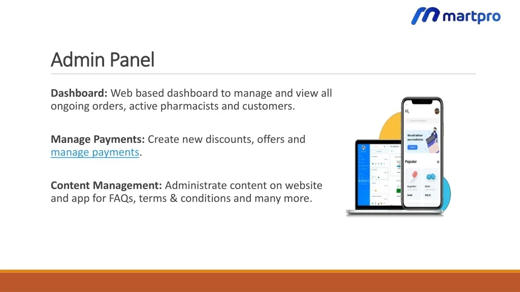 Admin Panel • Dashboard: Web based dashboard to manage and view all ongoing orders, active pharmacists and customers. • Manage Payments: Create new discounts, offers and manage payments. • Content Management: Administrate content on website and app for FAQs, terms & conditions and many more.