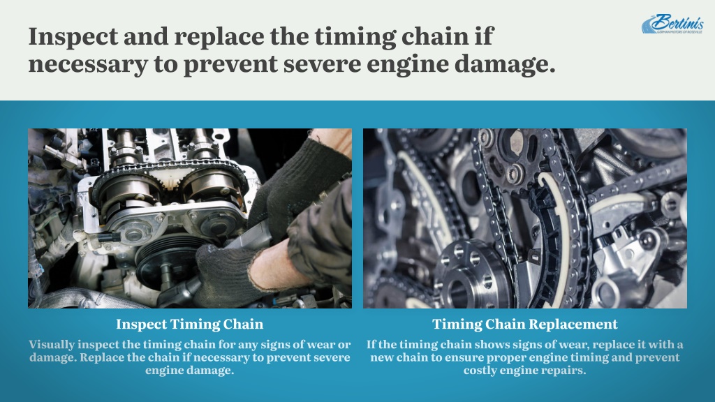 Inspect and replace the timing chain if necessary to prevent severe engine damage. Inspect Timing Chain Timing Chain Replacement Visually inspect the timing chain for any signs of wear or damage. Replace the chain if necessary to prevent severe engine damage. If the timing chain shows signs of wear, replace it with a new chain to ensure proper engine timing and prevent costly engine repairs.