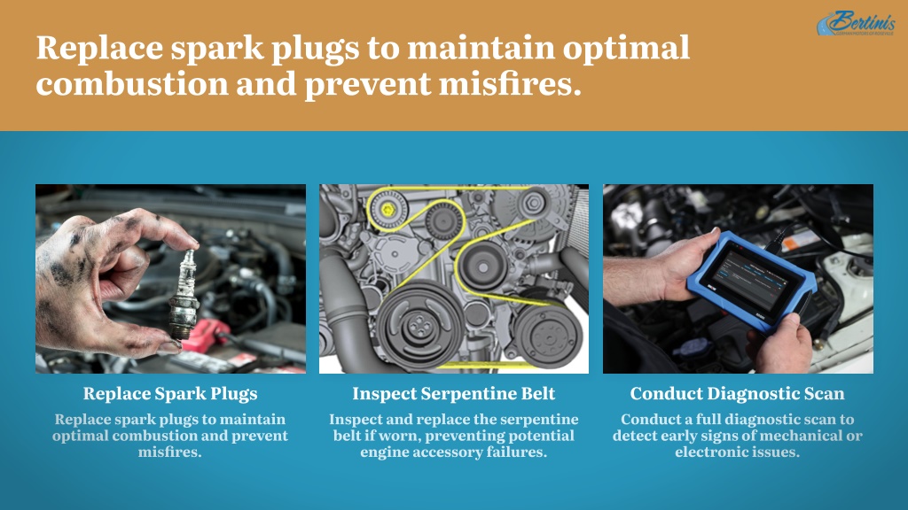 Replace spark plugs to maintain optimal combustion and prevent misfires. Replace Spark Plugs Inspect Serpentine Belt Conduct Diagnostic Scan Replace spark plugs to maintain optimal combustion and prevent misfires. Inspect and replace the serpentine belt if worn, preventing potential engine accessory failures. Conduct a full diagnostic scan to detect early signs of mechanical or electronic issues.