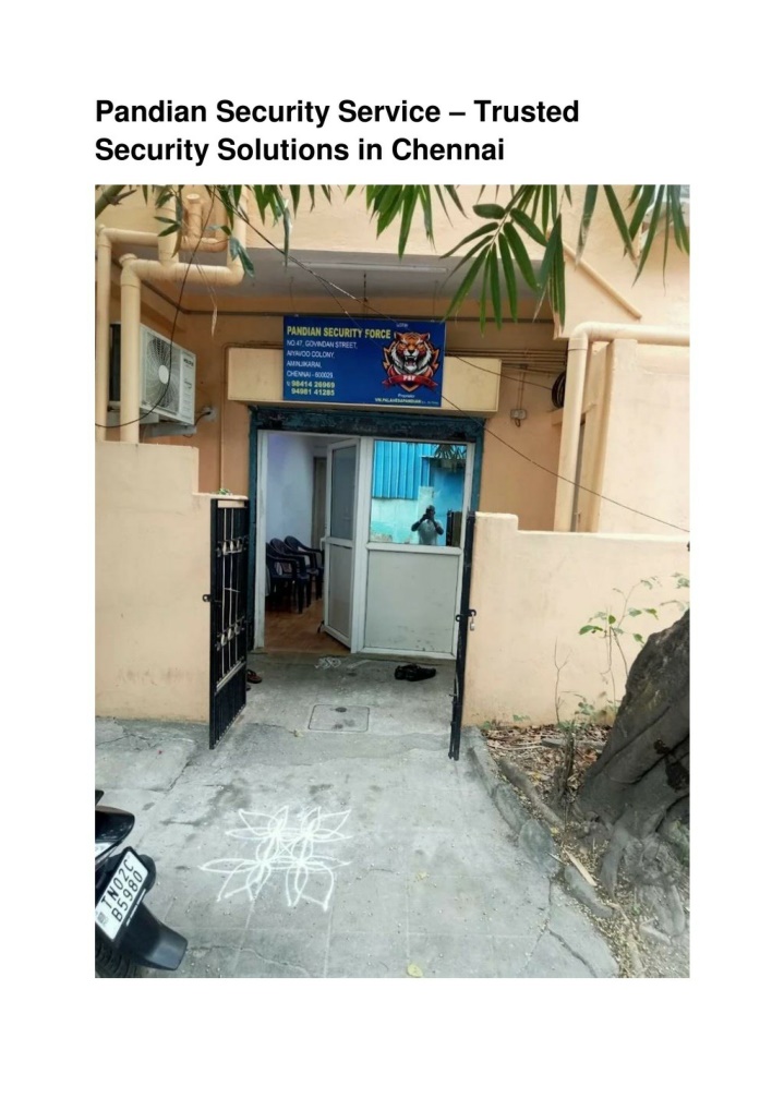 Pandian Security Service is a professional security service provider based in Aminjikarai, Chennai, Tamil Nadu. We specialize in delivering reliable, disciplined, and well-trained security personnel for residential, commercial, and industrial premises. With a strong focus on safety, vigilance, and integrity, our experienced security team ensures complete protection of people, property, and assets while maintaining the highest standards of professionalism and customer satisfaction.<br>https://pandiansecurityservice.hrmslyzoo.in<br>Palavesa Pandian<br>4, Govinda St, Ayyavoo Colony, Aminjikarai, Chennai,