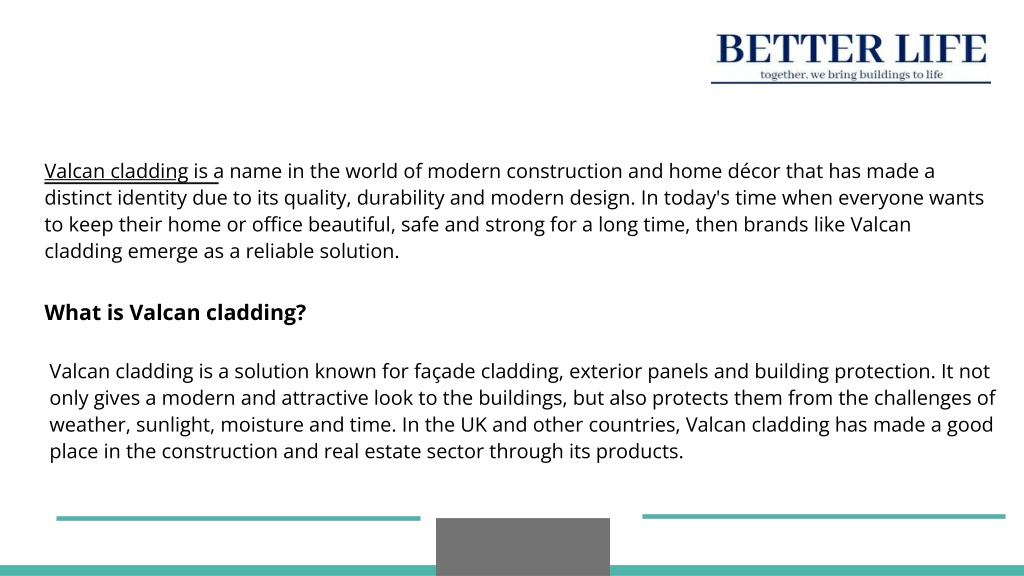 Conclusion Vulcan cladding is not just a construction material provider, but it is a smart solution to make your home or office safe, attractive and durable. If you are looking for a product that will keep your property safe for years to come and also give a modern look, then Vulcan cladding can prove to be an excellent option. Visit our website BETTER LIFE LTD and view the entire range of Vulcan cladding, or contact us to get expert advice and a customized solution for you.