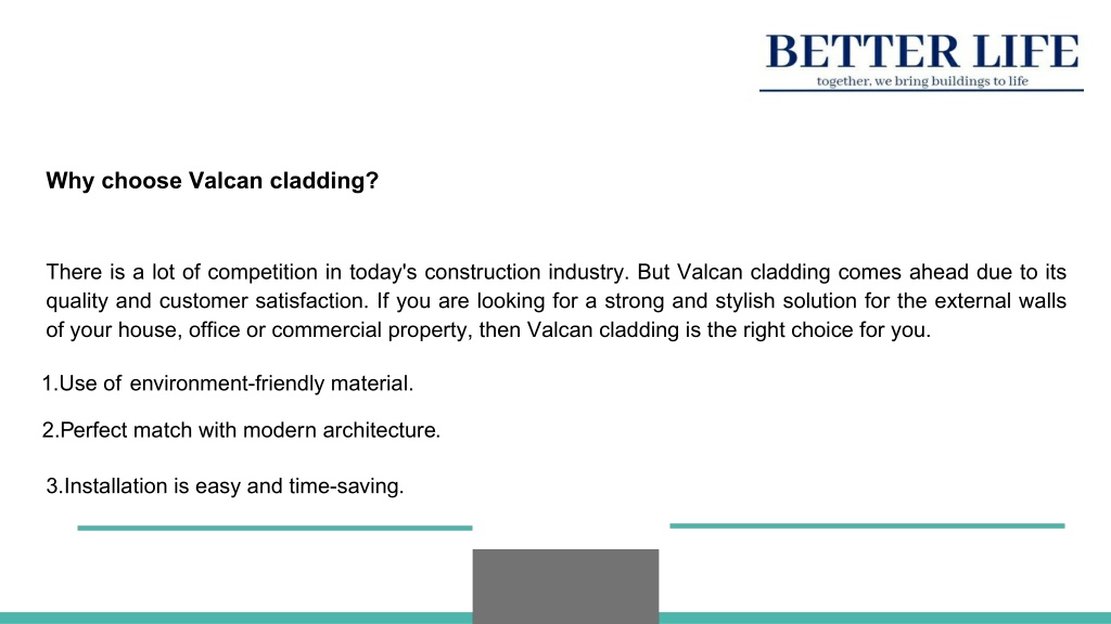 Why choose Valcan cladding? There is a lot of competition in today's construction industry. But Valcan cladding comes ahead due to its quality and customer satisfaction. If you are looking for a strong and stylish solution for the external walls of your house, office or commercial property, then Valcan cladding is the right choice for you. 1.Use of environment-friendly material. 2.Perfect match with modern architecture. 3.Installation is easy and time-saving.