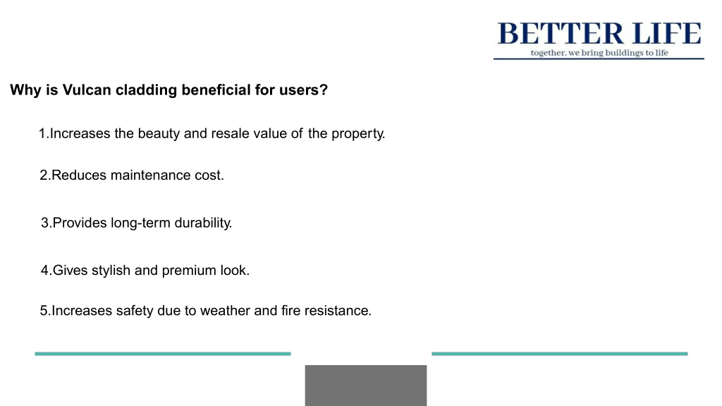 Why is Vulcan cladding beneficial for users? 1.Increases the beauty and resale value of the property. 2.Reduces maintenance cost. 3.Provides long-term durability. 4.Gives stylish and premium look. 5.Increases safety due to weather and fire resistance.