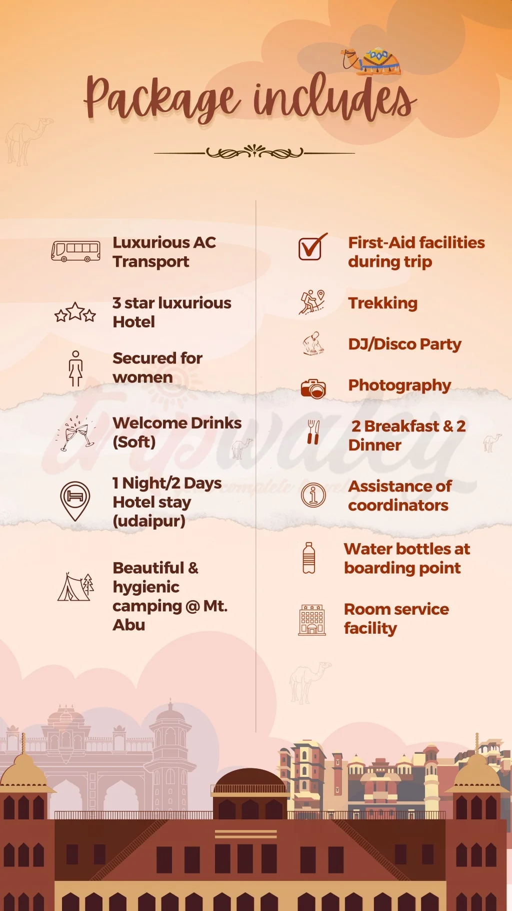 Package includes Package includes Package includes Luxurious AC Transport First-Aid facilities during trip 3 star luxurious Hotel Trekking DJ/Disco Party Secured for women Photography Welcome Drinks (Soft) 2 Breakfast & 2 Dinner 1 Night/2 Days Hotel stay (udaipur) Assistance of coordinators Water bottles at boarding point Beautiful & hygienic camping @ Mt. Abu Room service facility