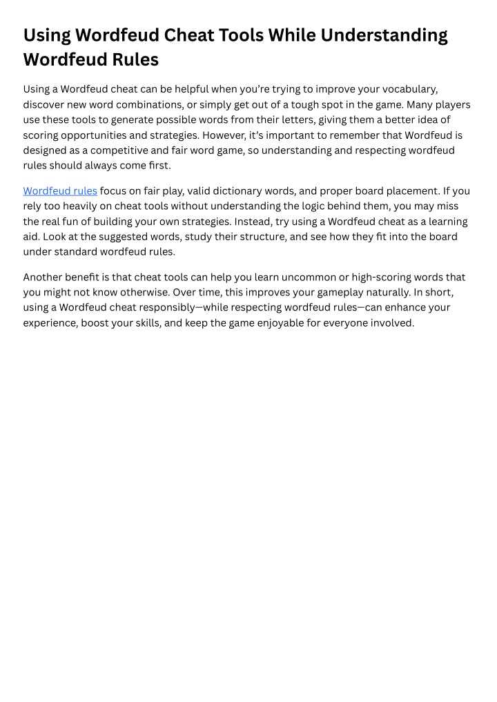 Using a Wordfeud cheat can be helpful when youu2019re trying to improve your vocabulary, discover new word combinations, or simply get out of a tough spot in the game. Many players use these tools to generate possible words from their letters, giving them a better idea of scoring opportunities and strategies. However, itu2019s important to remember that Wordfeud is designed as a competitive and fair word game, so understanding and respecting wordfeud rules should always come first.