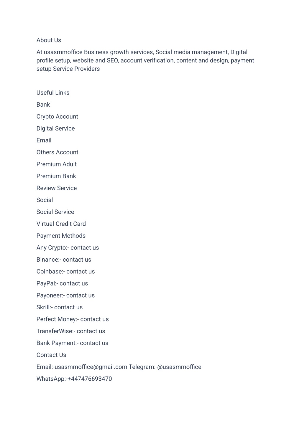 About Us At usasmmoffice Business growth services, Social media management, Digital profile setup, website and SEO, account verification, content and design, payment setup Service Providers Useful Links Bank Crypto Account Digital Service Email Others Account Premium Adult Premium Bank Review Service Social Social Service Virtual Credit Card Payment Methods Any Crypto:- contact us Binance:- contact us Coinbase:- contact us PayPal:- contact us Payoneer:- contact us Skrill:- contact us Perfect Money:- contact us TransferWise:- contact us Bank Payment:- contact us Contact Us Email:-usasmmoffice@gmail.com Telegram:-@usasmmoffice WhatsApp:-+447476693470