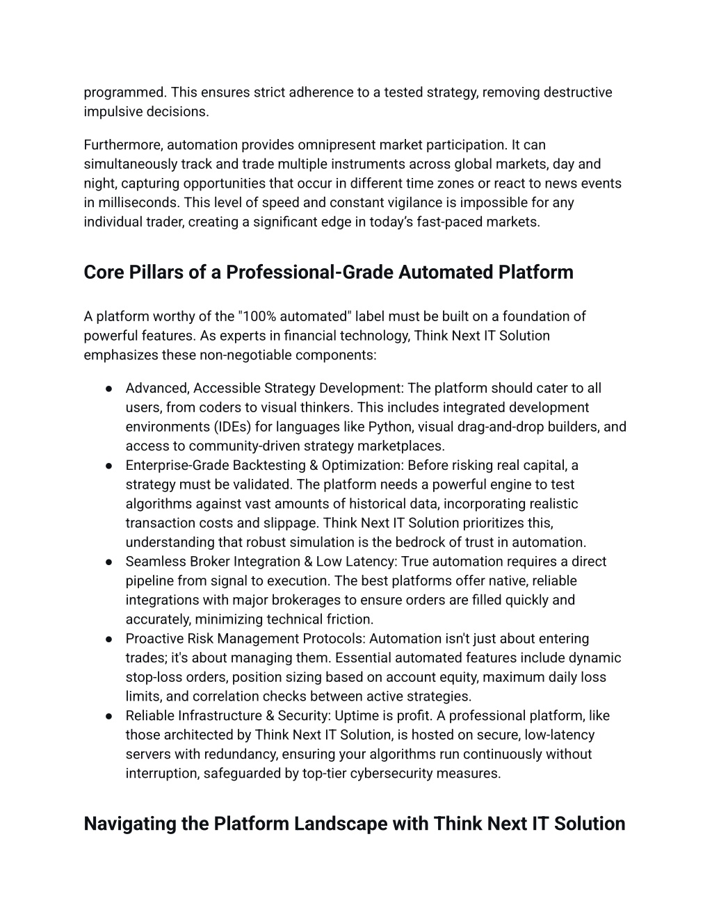programmed. This ensures strict adherence to a tested strategy, removing destructive impulsive decisions. Furthermore, automation provides omnipresent market participation. It can simultaneously track and trade multiple instruments across global markets, day and night, capturing opportunities that occur in different time zones or react to news events in milliseconds. This level of speed and constant vigilance is impossible for any individual trader, creating a significant edge in today’s fast-paced markets. Core Pillars of a Professional-Grade Automated Platform A platform worthy of the "100% automated" label must be built on a foundation of powerful features. As experts in financial technology, Think Next IT Solution emphasizes these non-negotiable components: ● Advanced, Accessible Strategy Development: The platform should cater to all users, from coders to visual thinkers. This includes integrated development environments (IDEs) for languages like Python, visual drag-and-drop builders, and access to community-driven strategy marketplaces. ● Enterprise-Grade Backtesting & Optimization: Before risking real capital, a strategy must be validated. The platform needs a powerful engine to test algorithms against vast amounts of historical data, incorporating realistic transaction costs and slippage. Think Next IT Solution prioritizes this, understanding that robust simulation is the bedrock of trust in automation. ● Seamless Broker Integration & Low Latency: True automation requires a direct pipeline from signal to execution. The best platforms offer native, reliable integrations with major brokerages to ensure orders are filled quickly and accurately, minimizing technical friction. ● Proactive Risk Management Protocols: Automation isn't just about entering trades; it's about managing them. Essential automated features include dynamic stop-loss orders, position sizing based on account equity, maximum daily loss limits, and correlation checks between active strategies. ● Reliable Infrastructure & Security: Uptime is profit. A professional platform, like those architected by Think Next IT Solution, is hosted on secure, low-latency servers with redundancy, ensuring your algorithms run continuously without interruption, safeguarded by top-tier cybersecurity measures. Navigating the Platform Landscape with Think Next IT Solution