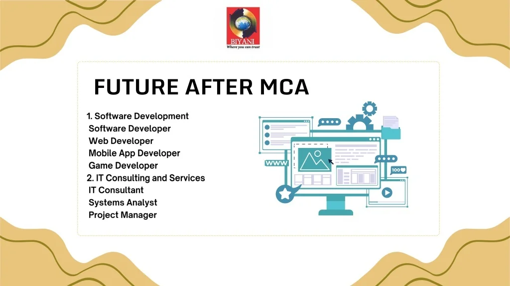 FUTURE AFTER MCA 1. Software Development Software Developer Web Developer Mobile App Developer Game Developer 2. IT Consulting and Services IT Consultant Systems Analyst Project Manager
