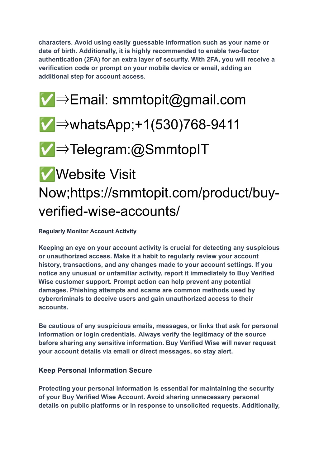 characters. Avoid using easily guessable information such as your name or date of birth. Additionally, it is highly recommended to enable two-factor authentication (2FA) for an extra layer of security. With 2FA, you will receive a verification code or prompt on your mobile device or email, adding an additional step for account access. ✅⇒Email: smmtopit@gmail.com ✅⇒whatsApp;+1(530)768-9411 ✅⇒Telegram:@SmmtopIT ✅Website Visit Now;https://smmtopit.com/product/buy- verified-wise-accounts/ Regularly Monitor Account Activity Keeping an eye on your account activity is crucial for detecting any suspicious or unauthorized access. Make it a habit to regularly review your account history, transactions, and any changes made to your account settings. If you notice any unusual or unfamiliar activity, report it immediately to Buy Verified Wise customer support. Prompt action can help prevent any potential damages. Phishing attempts and scams are common methods used by cybercriminals to deceive users and gain unauthorized access to their accounts. Be cautious of any suspicious emails, messages, or links that ask for personal information or login credentials. Always verify the legitimacy of the source before sharing any sensitive information. Buy Verified Wise will never request your account details via email or direct messages, so stay alert. Keep Personal Information Secure Protecting your personal information is essential for maintaining the security of your Buy Verified Wise Account. Avoid sharing unnecessary personal details on public platforms or in response to unsolicited requests. Additionally,
