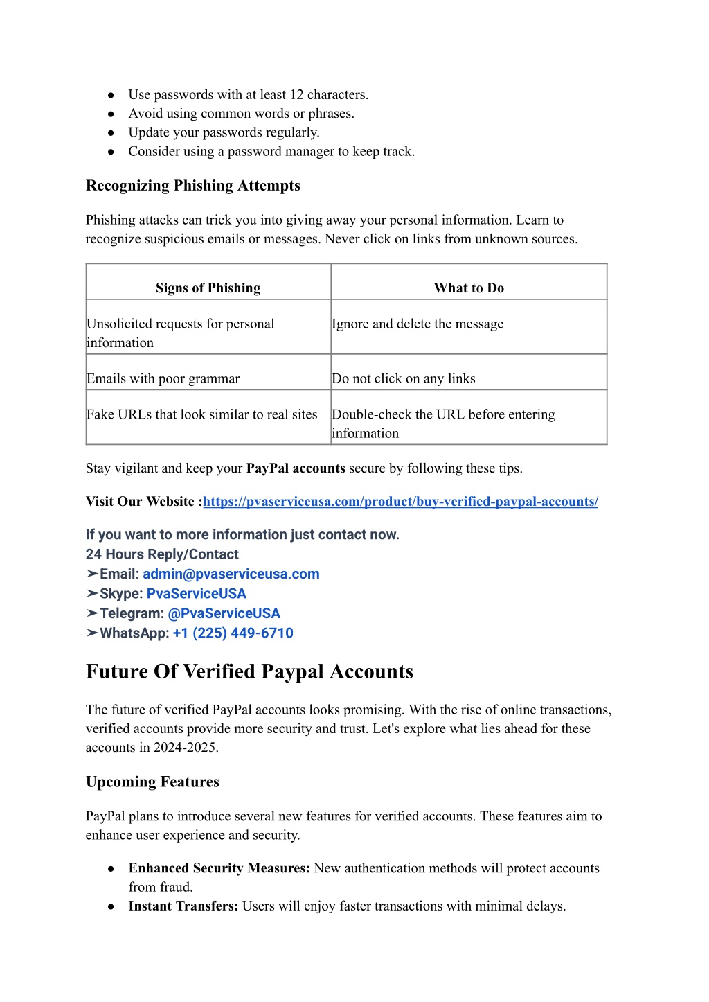 ● Use passwords with at least 12 characters. ● Avoid using common words or phrases. ● Update your passwords regularly. ● Consider using a password manager to keep track. Recognizing Phishing Attempts Phishing attacks can trick you into giving away your personal information. Learn to recognize suspicious emails or messages. Never click on links from unknown sources. Signs of Phishing What to Do Unsolicited requests for personal information Ignore and delete the message Emails with poor grammar Do not click on any links Fake URLs that look similar to real sites Double-check the URL before entering information Stay vigilant and keep your PayPal accounts secure by following these tips. Visit Our Website :https://pvaserviceusa.com/product/buy-verified-paypal-accounts/ If you want to more information just contact now. 24 Hours Reply/Contact ➤Email: admin@pvaserviceusa.com ➤Skype: PvaServiceUSA ➤Telegram: @PvaServiceUSA ➤WhatsApp: +1 (225) 449-6710 Future Of Verified Paypal Accounts The future of verified PayPal accounts looks promising. With the rise of online transactions, verified accounts provide more security and trust. Let's explore what lies ahead for these accounts in 2024-2025. Upcoming Features PayPal plans to introduce several new features for verified accounts. These features aim to enhance user experience and security. ● Enhanced Security Measures: New authentication methods will protect accounts from fraud. ● Instant Transfers: Users will enjoy faster transactions with minimal delays.