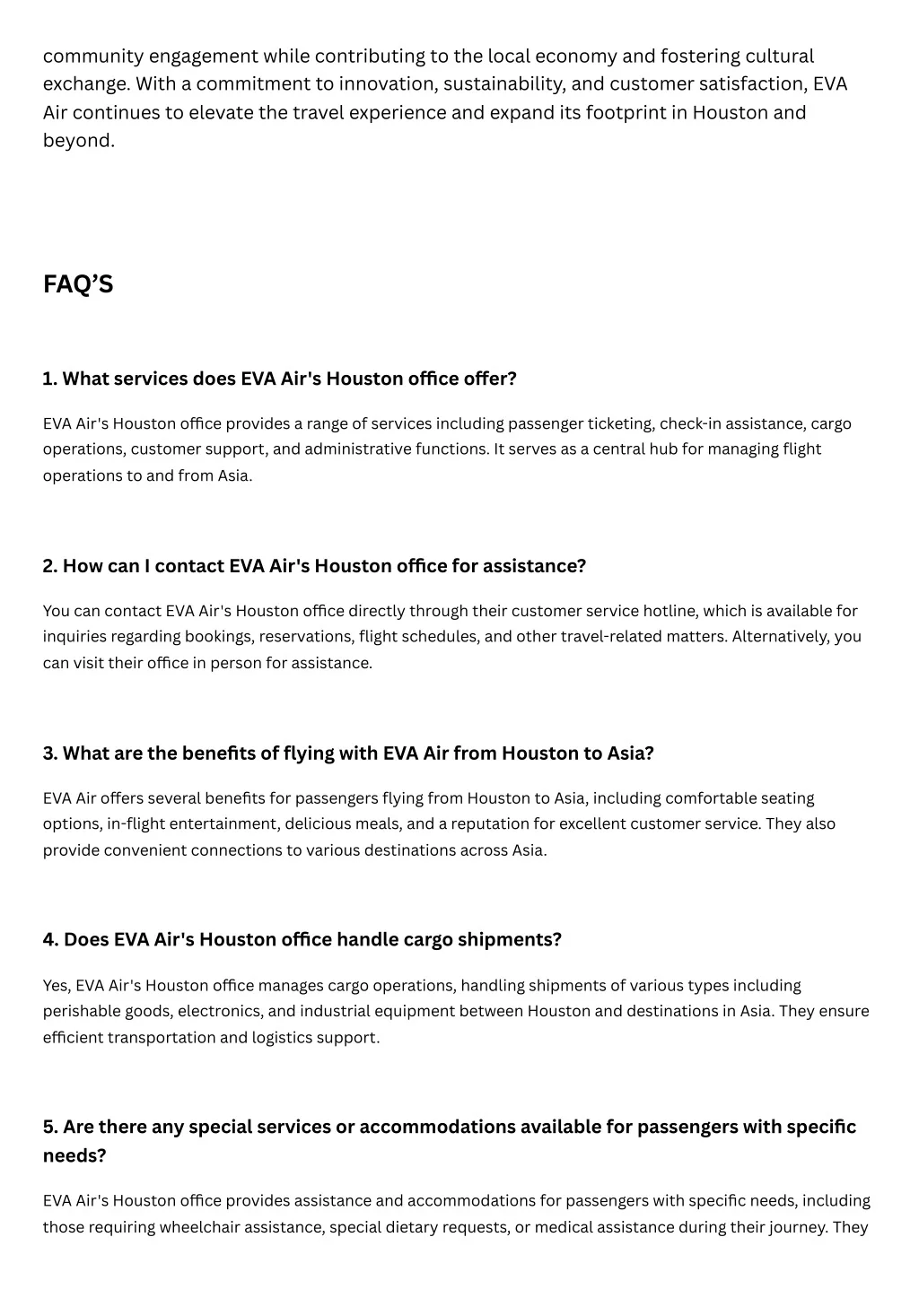 community engagement while contributing to the local economy and fostering cultural exchange. With a commitment to innovation, sustainability, and customer satisfaction, EVA Air continues to elevate the travel experience and expand its footprint in Houston and beyond. FAQ’S 1. What services does EVA Air's Houston o?ce o?er? EVA Air's Houston o?ce provides a range of services including passenger ticketing, check-in assistance, cargo operations, customer support, and administrative functions. It serves as a central hub for managing flight operations to and from Asia. 2. How can I contact EVA Air's Houston o?ce for assistance? You can contact EVA Air's Houston o?ce directly through their customer service hotline, which is available for inquiries regarding bookings, reservations, flight schedules, and other travel-related matters. Alternatively, you can visit their o?ce in person for assistance. 3. What are the benefits of flying with EVA Air from Houston to Asia? EVA Air o?ers several benefits for passengers flying from Houston to Asia, including comfortable seating options, in-flight entertainment, delicious meals, and a reputation for excellent customer service. They also provide convenient connections to various destinations across Asia. 4. Does EVA Air's Houston o?ce handle cargo shipments? Yes, EVA Air's Houston o?ce manages cargo operations, handling shipments of various types including perishable goods, electronics, and industrial equipment between Houston and destinations in Asia. They ensure e?cient transportation and logistics support. 5. Are there any special services or accommodations available for passengers with specific needs? EVA Air's Houston o?ce provides assistance and accommodations for passengers with specific needs, including those requiring wheelchair assistance, special dietary requests, or medical assistance during their journey. They