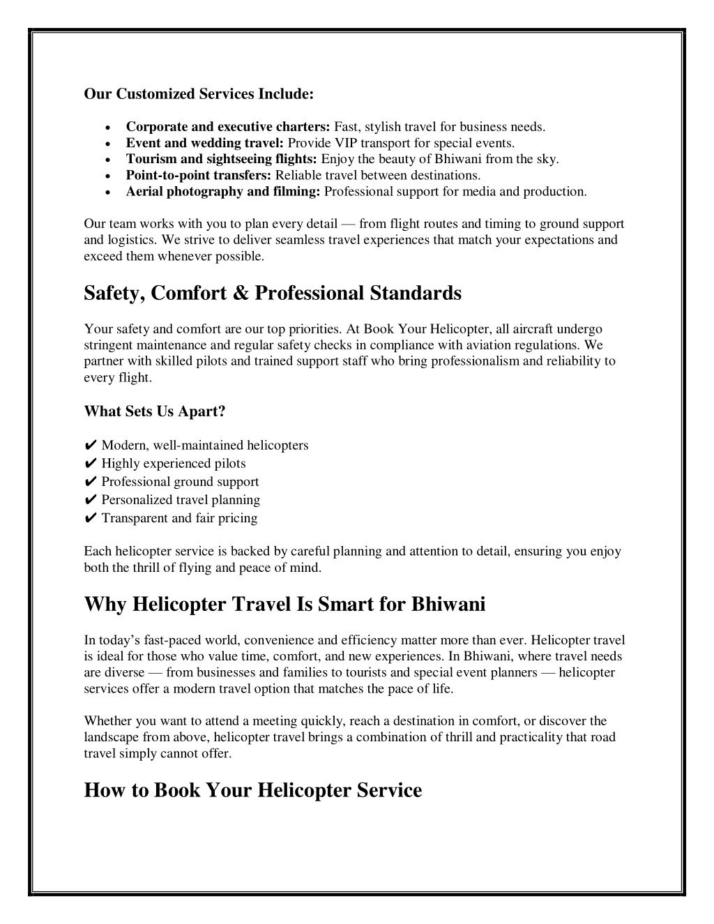 Our Customized Services Include: Corporate and executive charters: Fast, stylish travel for business needs. Event and wedding travel: Provide VIP transport for special events. Tourism and sightseeing flights: Enjoy the beauty of Bhiwani from the sky. Point-to-point transfers: Reliable travel between destinations. Aerial photography and filming: Professional support for media and production. Our team works with you to plan every detail — from flight routes and timing to ground support and logistics. We strive to deliver seamless travel experiences that match your expectations and exceed them whenever possible. Safety, Comfort & Professional Standards Your safety and comfort are our top priorities. At Book Your Helicopter, all aircraft undergo stringent maintenance and regular safety checks in compliance with aviation regulations. We partner with skilled pilots and trained support staff who bring professionalism and reliability to every flight. What Sets Us Apart? ✔ Modern, well-maintained helicopters ✔ Highly experienced pilots ✔ Professional ground support ✔ Personalized travel planning ✔ Transparent and fair pricing Each helicopter service is backed by careful planning and attention to detail, ensuring you enjoy both the thrill of flying and peace of mind. Why Helicopter Travel Is Smart for Bhiwani In today’s fast-paced world, convenience and efficiency matter more than ever. Helicopter travel is ideal for those who value time, comfort, and new experiences. In Bhiwani, where travel needs are diverse — from businesses and families to tourists and special event planners — helicopter services offer a modern travel option that matches the pace of life. Whether you want to attend a meeting quickly, reach a destination in comfort, or discover the landscape from above, helicopter travel brings a combination of thrill and practicality that road travel simply cannot offer. How to Book Your Helicopter Service