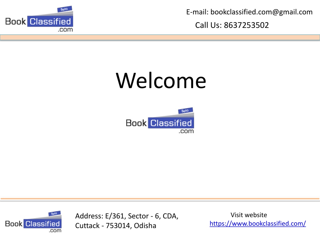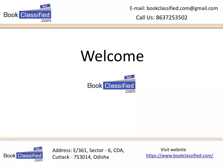 E-mail: bookclassified.com@gmail.com Call Us: 8637253502 Welcome Visit website https://www.bookclassified.com/ Address: E/361, Sector - 6, CDA, Cuttack - 753014, Odisha