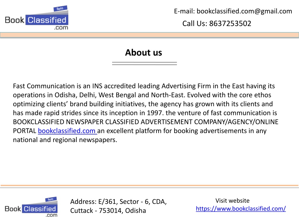 E-mail: bookclassified.com@gmail.com Call Us: 8637253502 About us Fast Communication is an INS accredited leading Advertising Firm in the East having its operations in Odisha, Delhi, West Bengal and North-East. Evolved with the core ethos optimizing clients’ brand building initiatives, the agency has grown with its clients and has made rapid strides since its inception in 1997. the venture of fast communication is BOOKCLASSIFIED NEWSPAPER CLASSIFIED ADVERTISEMENT COMPANY/AGENCY/ONLINE PORTAL bookclassified.com an excellent platform for booking advertisements in any national and regional newspapers. Visit website https://www.bookclassified.com/ Address: E/361, Sector - 6, CDA, Cuttack - 753014, Odisha