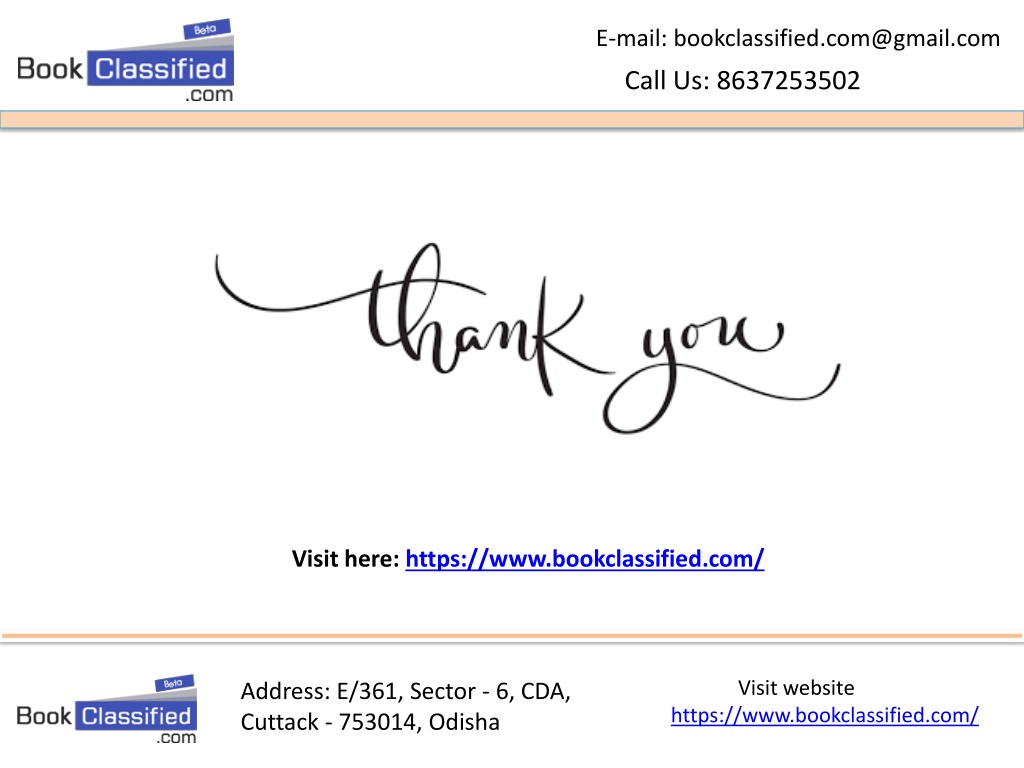E-mail: bookclassified.com@gmail.com Call Us: 8637253502 Bookclassified Advertisement Visit website https://www.bookclassified.com/ Address: E/361, Sector - 6, CDA, Cuttack - 753014, Odisha