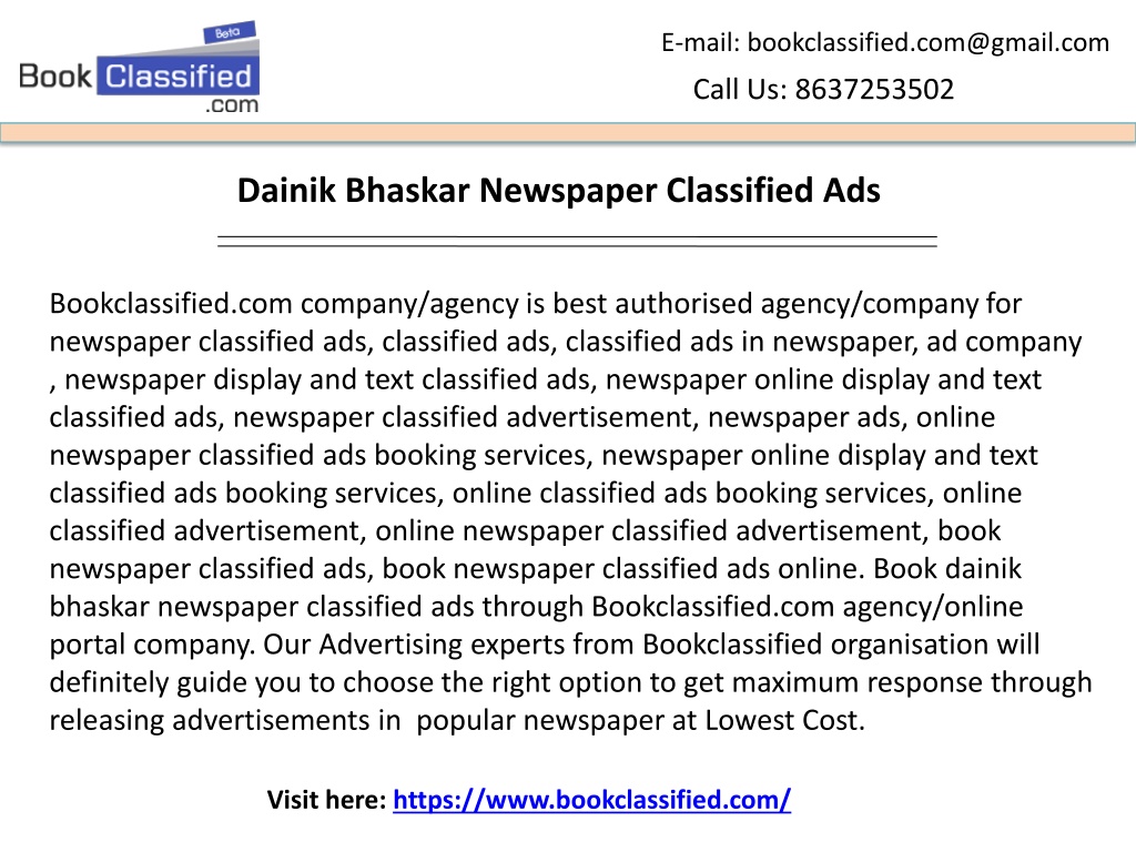 E-mail: bookclassified.com@gmail.com Call Us: 8637253502 DainikBhaskar Newspaper Classified Ads Bookclassified.com company/agency is best authorised agency/company for newspaper classified ads, classified ads, classified ads in newspaper, ad company , newspaper display and text classified ads, newspaper online display and text classified ads, newspaper classified advertisement, newspaper ads, online newspaper classified ads booking services, newspaper online display and text classified ads booking services, online classified ads booking services, online classified advertisement, online newspaper classified advertisement, book newspaper classified ads, book newspaper classified ads online. Book dainikbhaskar newspaper classified ads through Bookclassified.com agency/online portal company. Our Advertising experts from Bookclassifiedorganisation will definitely guide you to choose the right option to get maximum response through releasing advertisements in popular newspaper at Lowest Cost. Visit here: https://www.bookclassified.com/