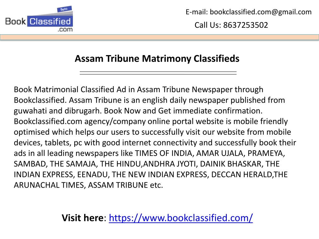 E-mail: bookclassified.com@gmail.com Call Us: 8637253502 Assam Tribune Matrimony Classifieds Book Matrimonial Classified Ad in Assam Tribune Newspaper through Bookclassified. Assam Tribune is an english daily newspaper published from guwahati and dibrugarh. Book Now and Get immediate confirmation. Bookclassified.com agency/company online portal website is mobile friendly optimised which helps our users to successfully visit our website from mobile devices, tablets, pc with good internet connectivity and successfully book their ads in all leading newspapers like TIMES OF INDIA, AMAR UJALA, PRAMEYA, SAMBAD, THE SAMAJA, THE HINDU,ANDHRA JYOTI, DAINIK BHASKAR, THE INDIAN EXPRESS, EENADU, THE NEW INDIAN EXPRESS, DECCAN HERALD,THE ARUNACHAL TIMES, ASSAM TRIBUNE etc. Visit here: https://www.bookclassified.com/