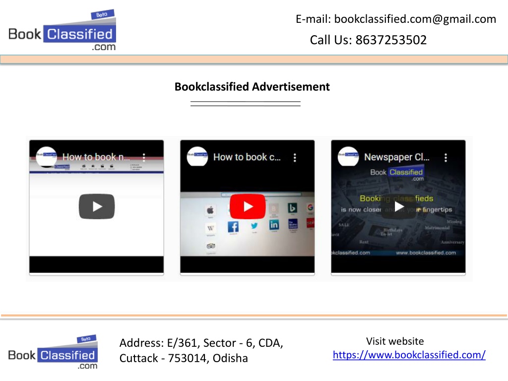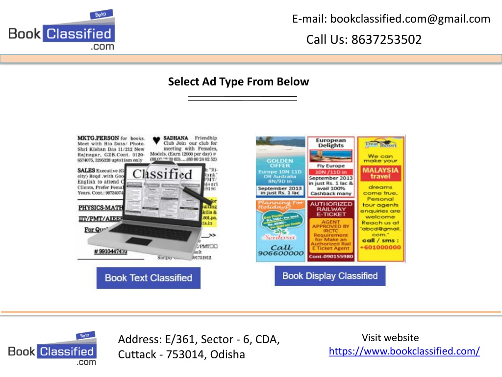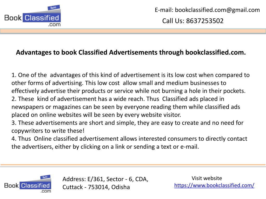 E-mail: bookclassified.com@gmail.com Call Us: 8637253502 Advantages to book Classified Advertisements through bookclassified.com. 1. One of the advantages of this kind of advertisement is its low cost when compared to other forms of advertising. This low cost allow small and medium businesses to effectively advertise their products or service while not burning a hole in their pockets.2. These kind of advertisement has a wide reach. Thus Classified ads placed in newspapers or magazines can be seen by everyone reading them while classified ads placed on online websites will be seen by every website visitor.3. These advertisements are short and simple, they are easy to create and no need for copywriters to write these!4. Thus Online classified advertisement allows interested consumers to directly contact the advertisers, either by clicking on a link or sending a text or e-mail. Visit website https://www.bookclassified.com/ Address: E/361, Sector - 6, CDA, Cuttack - 753014, Odisha