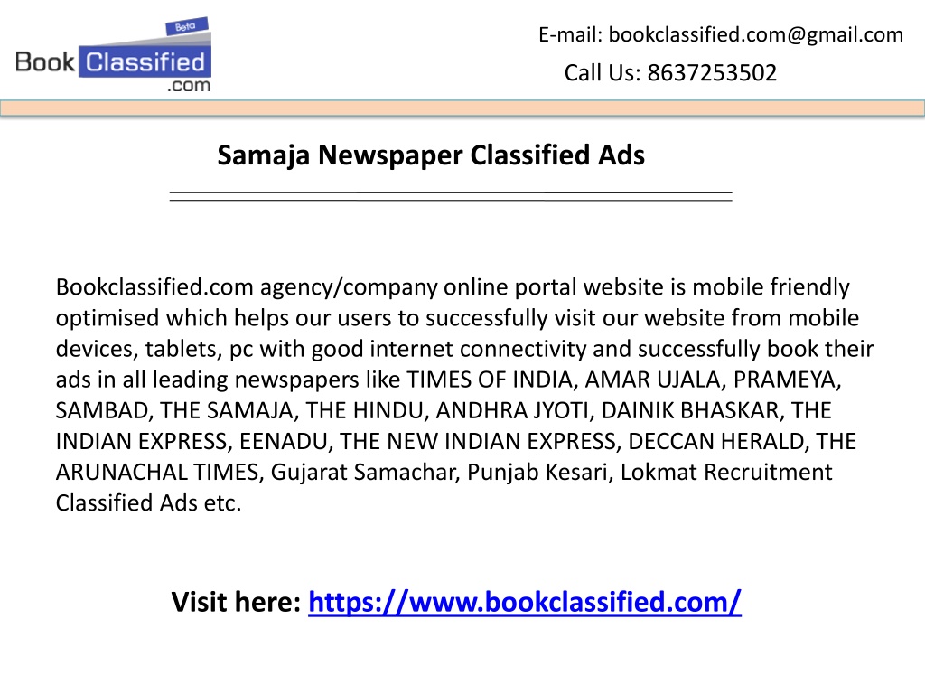 E-mail: bookclassified.com@gmail.com Call Us: 8637253502 Samaja Newspaper Classified Ads Bookclassified.com agency/company online portal website is mobile friendly optimised which helps our users to successfully visit our website from mobile devices, tablets, pc with good internet connectivity and successfully book their ads in all leading newspapers like TIMES OF INDIA, AMAR UJALA, PRAMEYA, SAMBAD, THE SAMAJA, THE HINDU, ANDHRA JYOTI, DAINIK BHASKAR, THE INDIAN EXPRESS, EENADU, THE NEW INDIAN EXPRESS, DECCAN HERALD, THE ARUNACHAL TIMES, Gujarat Samachar, Punjab Kesari, Lokmat Recruitment Classified Ads etc. Visit here: https://www.bookclassified.com/