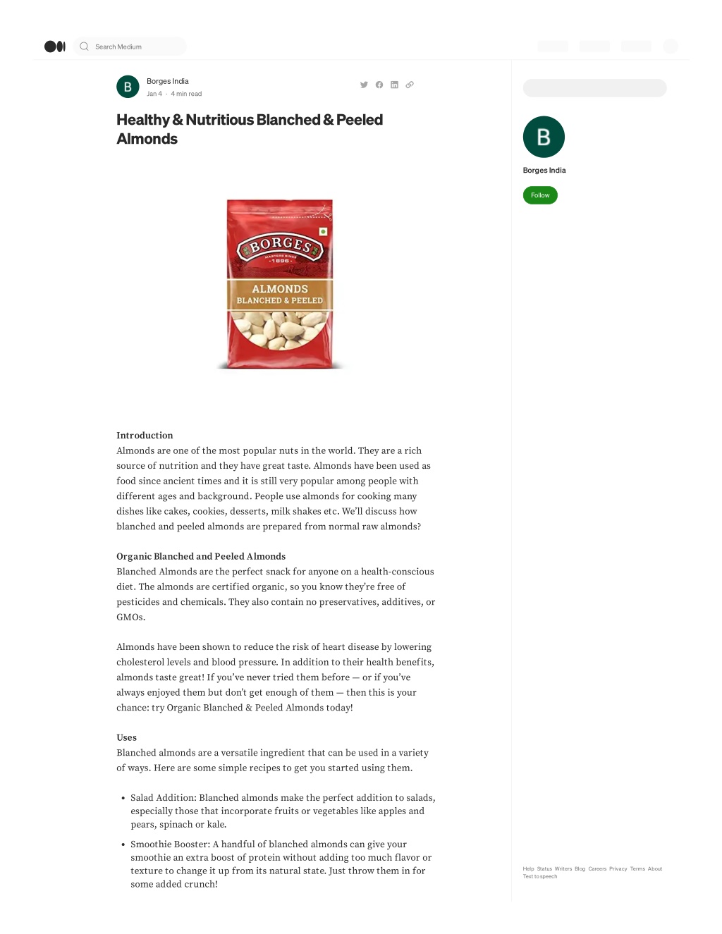 Search Medium Borges India Get unlimited access Jan 4 · 4 min read Healthy & Nutritious Blanched & Peeled Almonds Borges India Follow Introduction Almonds are one of the most popular nuts in the world. They are a rich source of nutrition and they have great taste. Almonds have been used as food since ancient times and it is still very popular among people with different ages and background. People use almonds for cooking many dishes like cakes, cookies, desserts, milk shakes etc. We’ll discuss how blanched and peeled almonds are prepared from normal raw almonds? Organic Blanched and Peeled Almonds Blanched Almonds are the perfect snack for anyone on a health-conscious diet. The almonds are certified organic, so you know they’re free of pesticides and chemicals. They also contain no preservatives, additives, or GMOs. Almonds have been shown to reduce the risk of heart disease by lowering cholesterol levels and blood pressure. In addition to their health benefits, almonds taste great! If you’ve never tried them before — or if you’ve always enjoyed them but don’t get enough of them — then this is your chance: try Organic Blanched & Peeled Almonds today! Uses Blanched almonds are a versatile ingredient that can be used in a variety of ways. Here are some simple recipes to get you started using them. Salad Addition: Blanched almonds make the perfect addition to salads, especially those that incorporate fruits or vegetables like apples and pears, spinach or kale. Smoothie Booster: A handful of blanched almonds can give your smoothie an extra boost of protein without adding too much flavor or texture to change it up from its natural state. Just throw them in for some added crunch! Help Status Writers Blog Careers Privacy Terms About Text to speech