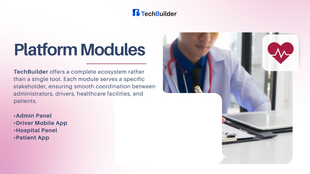 Platform Modules TechBuilder offers a complete ecosystem rather than a single tool. Each module serves a specific stakeholder, ensuring smooth coordination between administrators, drivers, healthcare facilities, and patients. •Admin Panel •Driver Mobile App •Hospital Panel •Patient App