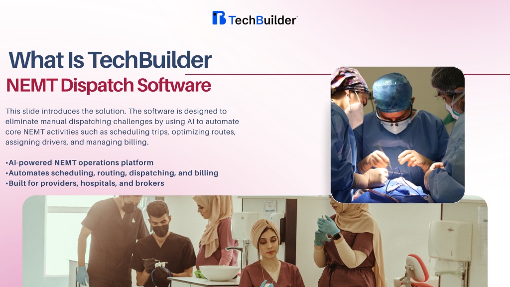 What Is TechBuilder NEMT Dispatch Software This slide introduces the solution. The software is designed to eliminate manual dispatching challenges by using AI to automate core NEMT activities such as scheduling trips, optimizing routes, assigning drivers, and managing billing. •AI-powered NEMT operations platform •Automates scheduling, routing, dispatching, and billing •Built for providers, hospitals, and brokers