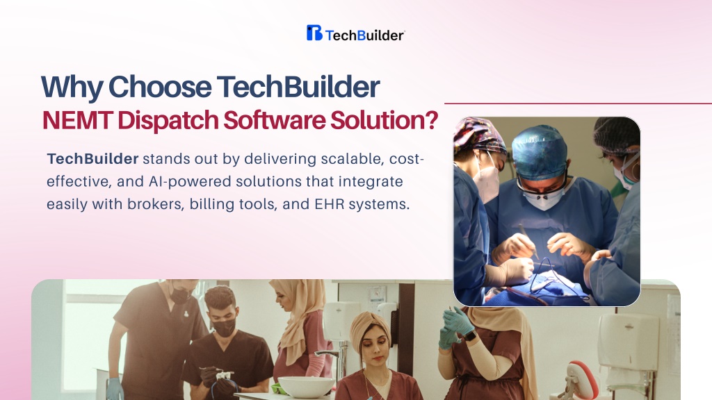 Why Choose TechBuilder NEMT Dispatch Software Solution? TechBuilder stands out by delivering scalable, cost- effective, and AI-powered solutions that integrate easily with brokers, billing tools, and EHR systems.