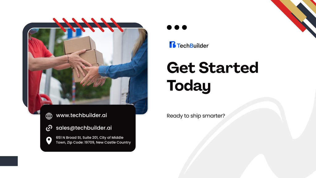 Get Started Today www.techbuilder.ai Ready to ship smarter? sales@techbuilder.ai 651 N Broad St, Suite 201, City of Middle Town, Zip Code: 19709, New Castle Country