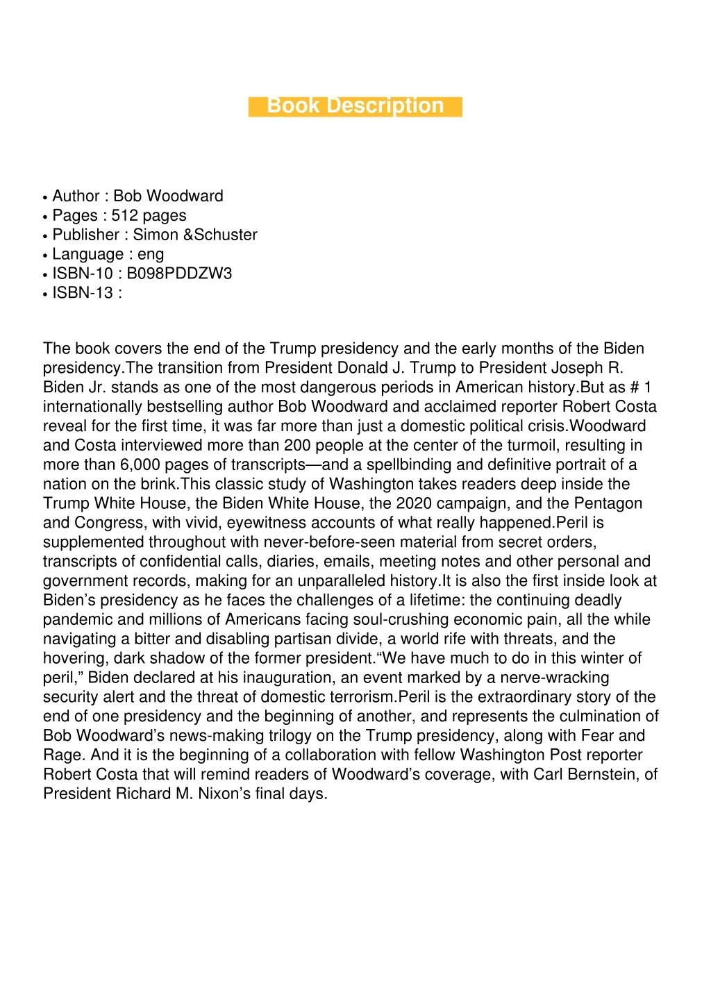 Book Description Author : Bob Woodward Pages : 512 pages Publisher : Simon &Schuster Language : eng ISBN-10 : B098PDDZW3 ISBN-13 : G G G G G G The book covers the end of the Trump presidency and the early months of the Biden presidency.The transition from President Donald J. Trump to President Joseph R. Biden Jr. stands as one of the most dangerous periods in American history.But as # 1 internationally bestselling author Bob Woodward and acclaimed reporter Robert Costa reveal for the first time, it was far more than just a domestic political crisis.Woodward and Costa interviewed more than 200 people at the center of the turmoil, resulting in more than 6,000 pages of transcripts—and a spellbinding and definitive portrait of a nation on the brink.This classic study of Washington takes readers deep inside the Trump White House, the Biden White House, the 2020 campaign, and the Pentagon and Congress, with vivid, eyewitness accounts of what really happened.Peril is supplemented throughout with never-before-seen material from secret orders, transcripts of confidential calls, diaries, emails, meeting notes and other personal and government records, making for an unparalleled history.It is also the first inside look at Biden’s presidency as he faces the challenges of a lifetime: the continuing deadly pandemic and millions of Americans facing soul-crushing economic pain, all the while navigating a bitter and disabling partisan divide, a world rife with threats, and the hovering, dark shadow of the former president.“We have much to do in this winter of peril,” Biden declared at his inauguration, an event marked by a nerve-wracking security alert and the threat of domestic terrorism.Peril is the extraordinary story of the end of one presidency and the beginning of another, and represents the culmination of Bob Woodward’s news-making trilogy on the Trump presidency, along with Fear and Rage. And it is the beginning of a collaboration with fellow Washington Post reporter Robert Costa that will remind readers of Woodward’s coverage, with Carl Bernstein, of President Richard M. Nixon’s final days.