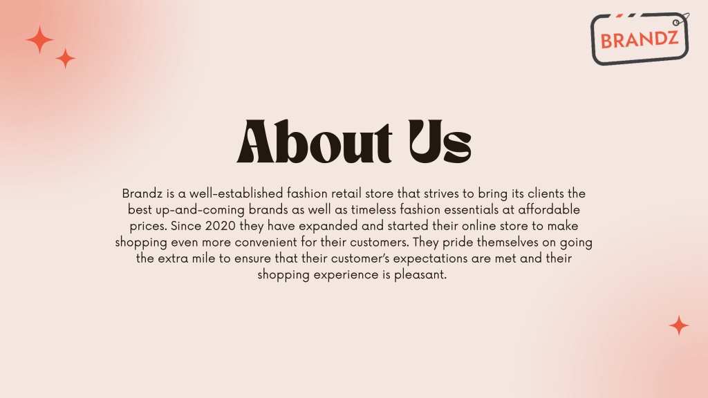 About Us Brandz is a well-established fashion retail store that strives to bring its clients the best up-and-coming brands as well as timeless fashion essentials at affordable prices. Since 2020 they have expanded and started their online store to make shopping even more convenient for their customers. They pride themselves on going the extra mile to ensure that their customer’s expectations are met and their shopping experience is pleasant.