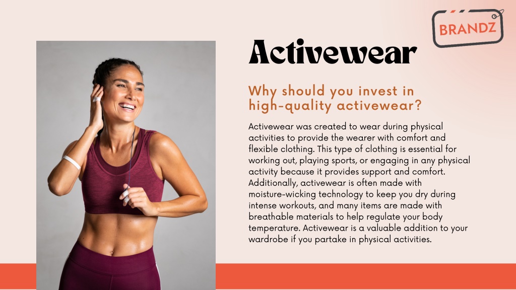 Activewear Why should you invest in high-quality activewear? Activewear was created to wear during physical activities to provide the wearer with comfort and flexible clothing. This type of clothing is essential for working out, playing sports, or engaging in any physical activity because it provides support and comfort. Additionally, activewear is often made with moisture-wicking technology to keep you dry during intense workouts, and many items are made with breathable materials to help regulate your body temperature. Activewear is a valuable addition to your wardrobe if you partake in physical activities.