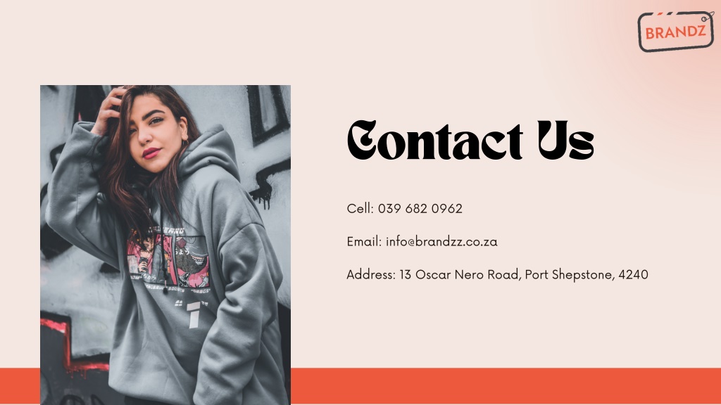 Contact Us Cell: 039 682 0962 Email: info@brandzz.co.za Address: 13 Oscar Nero Road, Port Shepstone, 4240