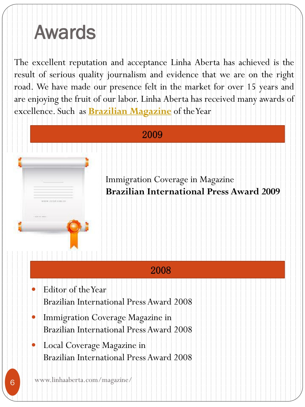 Awards The excellent reputation and acceptance LinhaAberta has achieved is the result of serious quality journalism and evidence that we are on the right road. We have made our presence felt in the market for over 15 years and are enjoying the fruit of our labor. LinhaAberta has received many awards of excellence. Such as Brazilian Magazineof the Year 2009 • Immigration Coverage in MagazineBrazilian International Press Award 2009 2008 • Editor of the Year Brazilian International Press Award 2008 • Immigration Coverage Magazine in Brazilian International Press Award 2008 • Local Coverage Magazine in Brazilian International Press Award 2008 www.linhaaberta.com/magazine/
