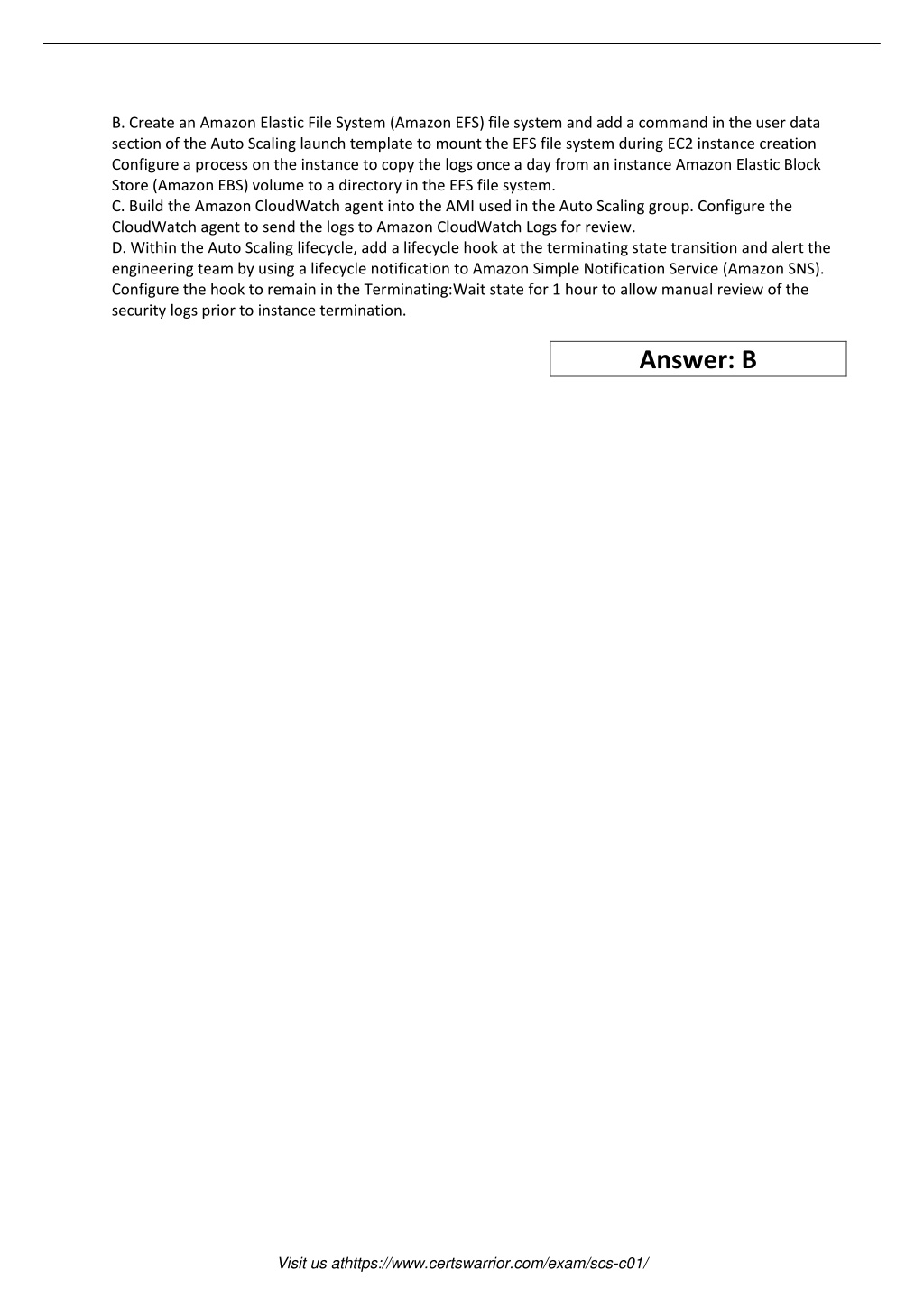 B. Create an Amazon Elastic File System (Amazon EFS) file system and add a command in the user data section of the Auto Scaling launch template to mount the EFS file system during EC2 instance creation Configure a process on the instance to copy the logs once a day from an instance Amazon Elastic Block Store (Amazon EBS) volume to a directory in the EFS file system. C. Build the Amazon CloudWatch agent into the AMI used in the Auto Scaling group. Configure the CloudWatch agent to send the logs to Amazon CloudWatch Logs for review. D. Within the Auto Scaling lifecycle, add a lifecycle hook at the terminating state transition and alert the engineering team by using a lifecycle notification to Amazon Simple Notification Service (Amazon SNS). Configure the hook to remain in the Terminating:Wait state for 1 hour to allow manual review of the security logs prior to instance termination. Answer: B Visit us athttps://www.certswarrior.com/exam/scs-c01/