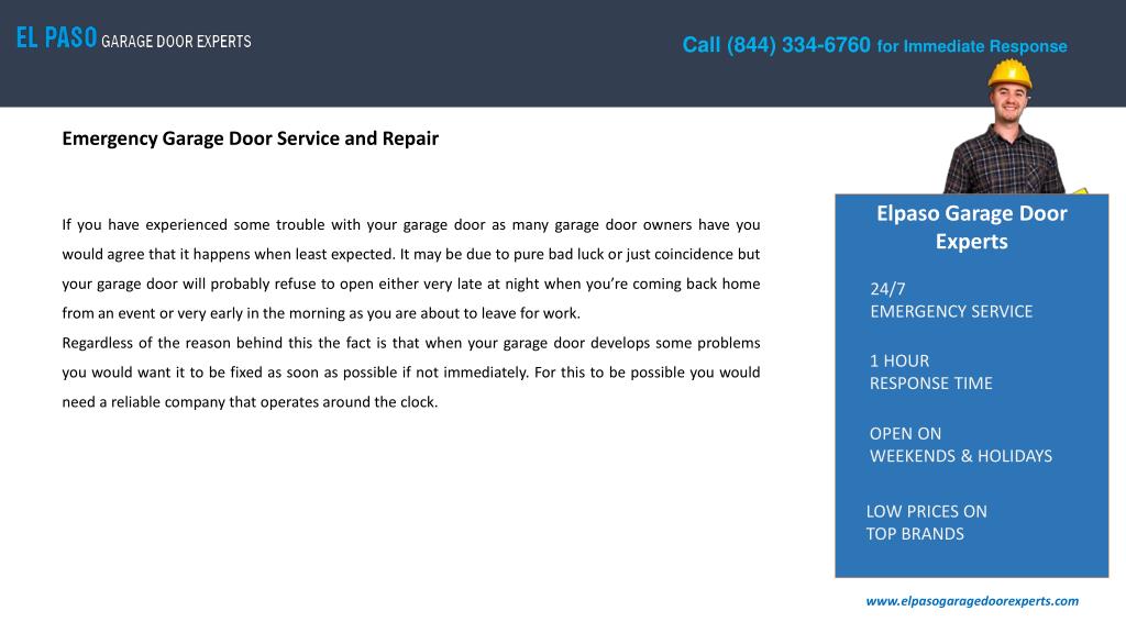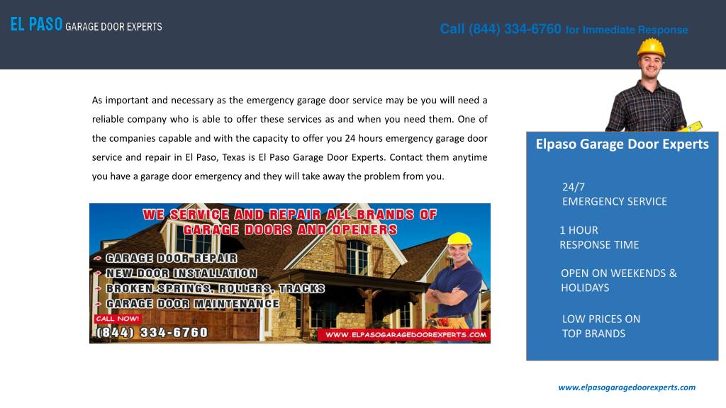 Call (844) 334-6760 for Immediate Response Emergency Garage Door Service and Repair Elpaso Garage Door Experts If you have experienced some trouble with your garage door as many garage door owners have you would agree that it happens when least expected. It may be due to pure bad luck or just coincidence but your garage door will probably refuse to open either very late at night when you’re coming back home from an event or very early in the morning as you are about to leave for work. Regardless of the reason behind this the fact is that when your garage door develops some problems you would want it to be fixed as soon as possible if not immediately. For this to be possible you would need a reliable company that operates around the clock. 24/7 EMERGENCY SERVICE 1 HOUR RESPONSE TIME OPEN ON WEEKENDS & HOLIDAYS LOW PRICES ON TOP BRANDS www.elpasogaragedoorexperts.com