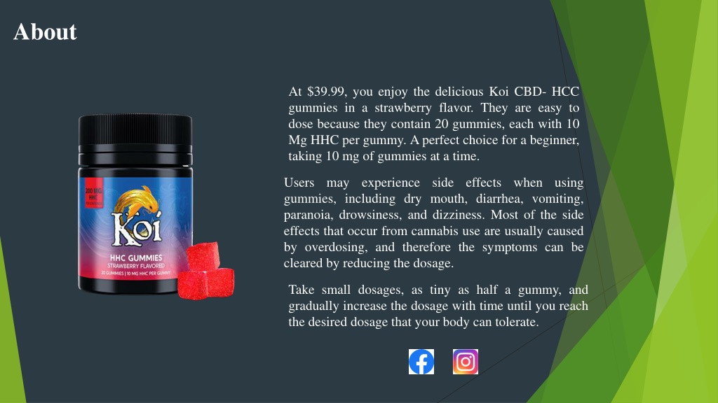 About At $39.99, you enjoy the delicious Koi CBD- HCC gummies in a strawberry flavor. They are easy to dose because they contain 20 gummies, each with 10 Mg HHC per gummy. A perfect choice for a beginner, taking 10 mg of gummies at a time. Users may experience side effects when using gummies, including dry mouth, diarrhea, vomiting, paranoia, drowsiness, and dizziness. Most of the side effects that occur from cannabis use are usually caused by overdosing, and therefore the symptoms can be cleared by reducing the dosage. Take small dosages, as tiny as half a gummy, and gradually increase the dosage with time until you reach the desired dosage that your body can tolerate.