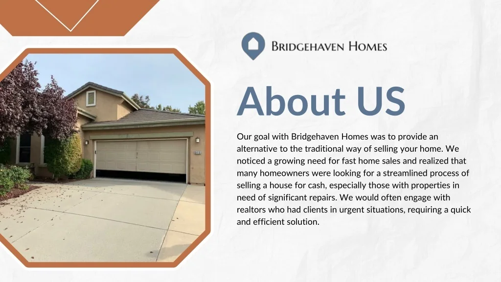 About US Our goal with Bridgehaven Homes was to provide an alternative to the traditional way of selling your home. We noticed a growing need for fast home sales and realized that many homeowners were looking for a streamlined process of selling a house for cash, especially those with properties in need of significant repairs. We would often engage with realtors who had clients in urgent situations, requiring a quick and efficient solution.