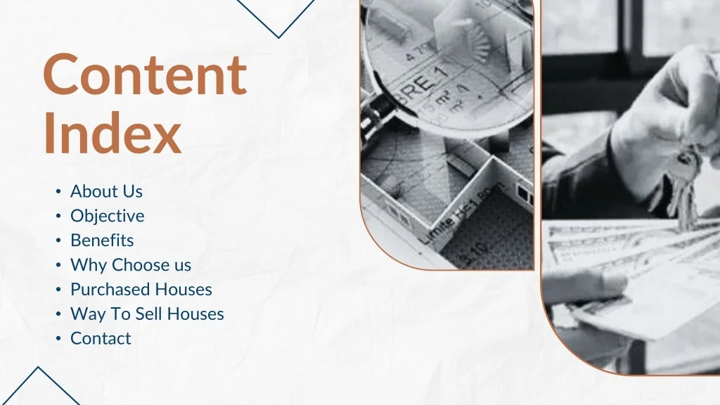 Content Index • About Us • Objective • Benefits • Why Choose us • Purchased Houses • Way To Sell Houses • Contact