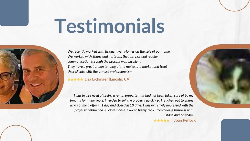 Testimonials We recently worked with Bridgehaven Homes on the sale of our home. We worked with Shane and his team, their service and regular communication through the process was excellent. They have a great understanding of the real estate market and treat their clients with the utmost professionalism Lisa Eichinger [Lincoln, CA] I was in dire need of selling a rental property that had not been taken care of by my tenants for many years. I needed to sell the property quickly so I reached out to Shane who got me a offer in 1 day and closed in 10 days. I was extremely impressed with the professionalism and quick response. I would highly recommend doing business with Shane and his team. Joan Perlock