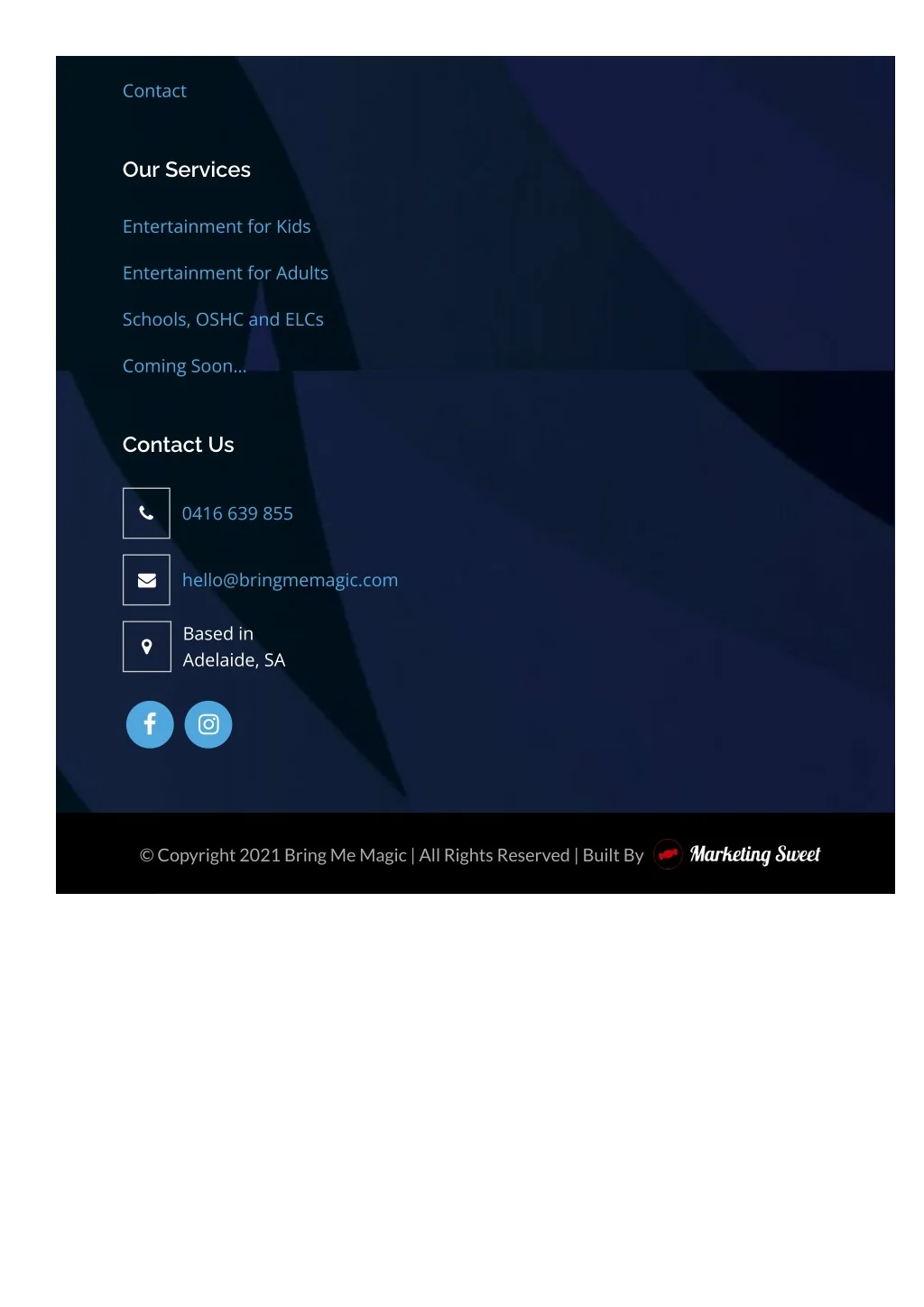 Contact Our Services Entertainment for Kids Entertainment for Adults Schools, OSHC and ELCs Coming Soon… Contact Us 0416 639 855 hello@bringmemagic.com Based in Adelaide, SA © Copyright 2021 Bring Me Magic | All Rights Reserved | Built By
