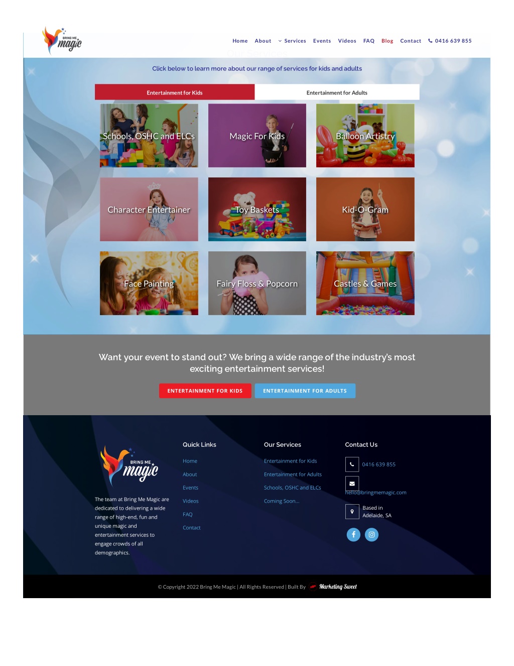 Home About Services Events Videos FAQ Blog Contact 0416 639 855 Our Services Click below to learn more about our range of services for kids and adults Entertainment for Kids Entertainment for Adults Schools, OSHC and ELCs Schools, OSHC and ELCs Magic For Kids Magic For Kids Balloon Artistry Balloon Artistry Character Entertainer Character Entertainer Toy Baskets Toy Baskets Kid-O-Gram Kid-O-Gram Face Painting Face Painting Fairy Floss & Popcorn Fairy Floss & Popcorn Castles & Games Castles & Games Want your event to stand out? We bring a wide range of the industry’s most exciting entertainment services! ENTERTAINMENT FOR KIDS ENTERTAINMENT FOR ADULTS Quick Links Our Services Contact Us Home Entertainment for Kids 0416 639 855 About Entertainment for Adults Events Schools, OSHC and ELCs hello@bringmemagic.com The team at Bring Me Magic are Videos Coming Soon… Based in Adelaide, SA dedicated to delivering a wide FAQ range of high-end, fun and unique magic and Contact entertainment services to engage crowds of all demographics. © Copyright 2022 Bring Me Magic | All Rights Reserved | Built By