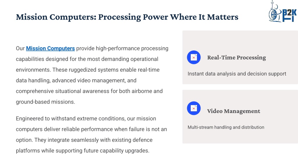 Mission Computers: Processing Power Where It Matters Our Mission Computers provide high-performance processing capabilities designed for the most demanding operational environments. These ruggedized systems enable real-time data handling, advanced video management, and comprehensive situational awareness for both airborne and ground-based missions. Real-Time Processing Instant data analysis and decision support Video Management Engineered to withstand extreme conditions, our mission computers deliver reliable performance when failure is not an option. They integrate seamlessly with existing defence platforms while supporting future capability upgrades. Multi-stream handling and distribution