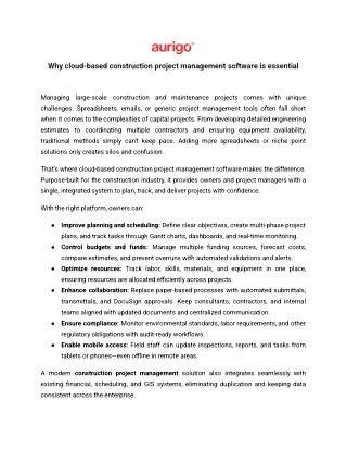 The benefits are clear: projects stay on schedule, within budget, and aligned with compliance requirements, while stakeholders have full visibility into progress and risks. Owners gain the ability to adapt quickly as projects evolve, ensuring efficient use of resources and stronger accountability at every stage. If you’re ready to simplify the complexity of managing capital and construction projects, explore how Masterworks Construction Project Management Software can help deliver your programs with greater efficiency and predictability. Visit now https://www.aurigo.com/products/online-construction-project-mgmt-software/