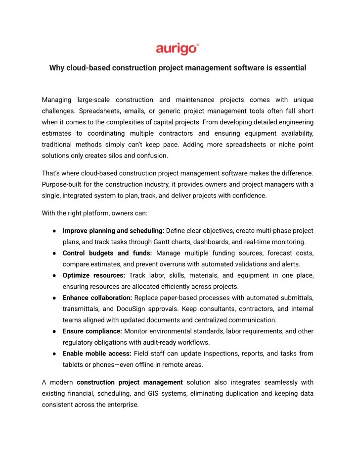 Why cloud-based construction project management software is essential Managing large-scale construction and maintenance projects comes with unique challenges. Spreadsheets, emails, or generic project management tools often fall short when it comes to the complexities of capital projects. From developing detailed engineering estimates to coordinating multiple contractors and ensuring equipment availability, traditional methods simply can’t keep pace. Adding more spreadsheets or niche point solutions only creates silos and confusion. That’s where cloud-based construction project management software makes the difference. Purpose-built for the construction industry, it provides owners and project managers with a single, integrated system to plan, track, and deliver projects with confidence. With the right platform, owners can: ● Improve planning and scheduling: Define clear objectives, create multi-phase project plans, and track tasks through Gantt charts, dashboards, and real-time monitoring. ● Control budgets and funds: Manage multiple funding sources, forecast costs, compare estimates, and prevent overruns with automated validations and alerts. ● Optimize resources: Track labor, skills, materials, and equipment in one place, ensuring resources are allocated efficiently across projects. ● Enhance collaboration: Replace paper-based processes with automated submittals, transmittals, and DocuSign approvals. Keep consultants, contractors, and internal teams aligned with updated documents and centralized communication. ● Ensure compliance: Monitor environmental standards, labor requirements, and other regulatory obligations with audit-ready workflows. ● Enable mobile access: Field staff can update inspections, reports, and tasks from tablets or phones—even offline in remote areas. A modern construction project management solution also integrates seamlessly with existing financial, scheduling, and GIS systems, eliminating duplication and keeping data consistent across the enterprise.