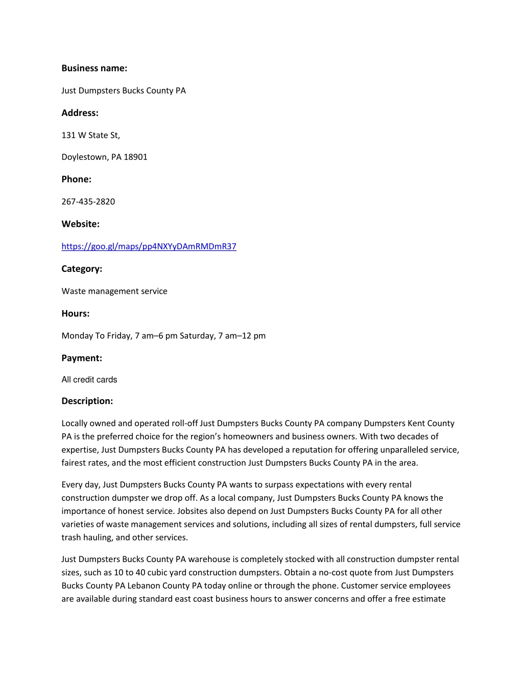 Address:<br>131 W State St, <br>Doylestown, PA 18901<br>Phone:<br>267-435-2820<br>Website:<br>https://goo.gl/maps/pp4NXYyDAmRMDmR37<br>Category:<br>Waste management service<br>Hours:<br>Monday To Friday, 7u202famu20136u202fpm Saturday, 7u202famu201312u202fpm<br>Payment:<br>All credit cards<br>Description:<br>Locally owned and operated roll-off Just Dumpsters Bucks County PA company Dumpsters Kent County PA is the preferred choice for the regionu2019s homeowners and business owners. With two decades of expertise, Just Dumpsters Bucks County PA has developed a reputation for offering unparalleled service, fairest rates, and the most efficient construction .