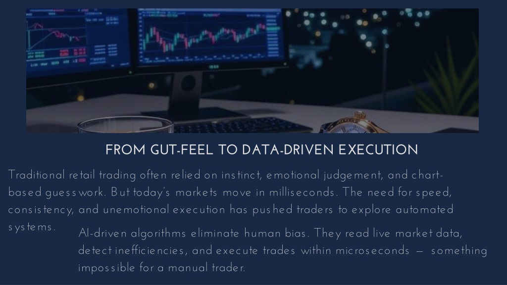 3. FROM GUT-FEEL TO DATA-DRIVEN EXECUTION Traditional retail trading often relied on instinct, emotional judgement, and chart-based guesswork. But today’s markets move in milliseconds. The need for speed, consistency, and unemotional execution has pushed traders to explore automated systems. AI-driven algorithms eliminate human bias. They read live market data, detect inefficiencies, and execute trades within microseconds — something impossible for a manual trader.