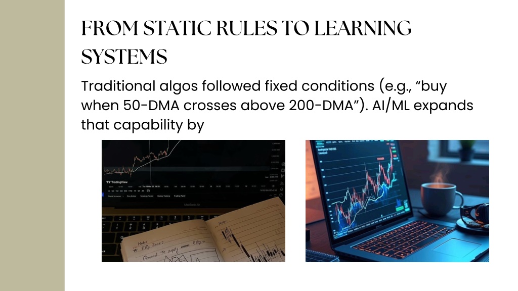 3. FROM STATIC RULES TO LEARNING SYSTEMS Traditional algos followed fixed conditions (e.g., “buy when 50-DMA crosses above 200-DMA”). AI/ML expands that capability by