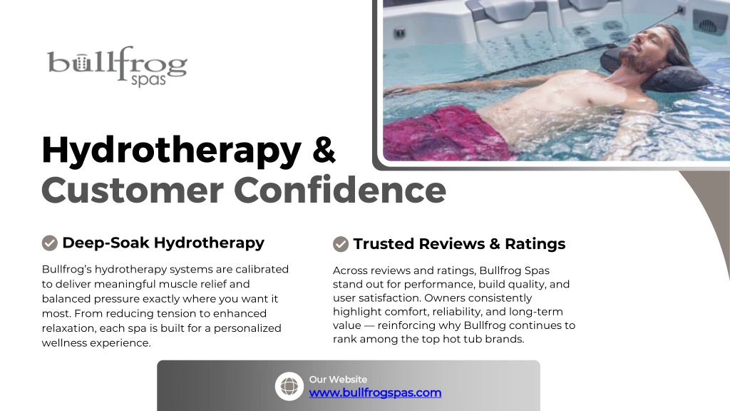 Hydrotherapy & Customer Confidence Deep-Soak Hydrotherapy Trusted Reviews & Ratings Bullfrog’s hydrotherapy systems are calibrated to deliver meaningful muscle relief and balanced pressure exactly where you want it most. From reducing tension to enhanced relaxation, each spa is built for a personalized wellness experience. Across reviews and ratings, Bullfrog Spas stand out for performance, build quality, and user satisfaction. Owners consistently highlight comfort, reliability, and long-term value — reinforcing why Bullfrog continues to rank among the top hot tub brands. Our Website www.bullfrogspas.com