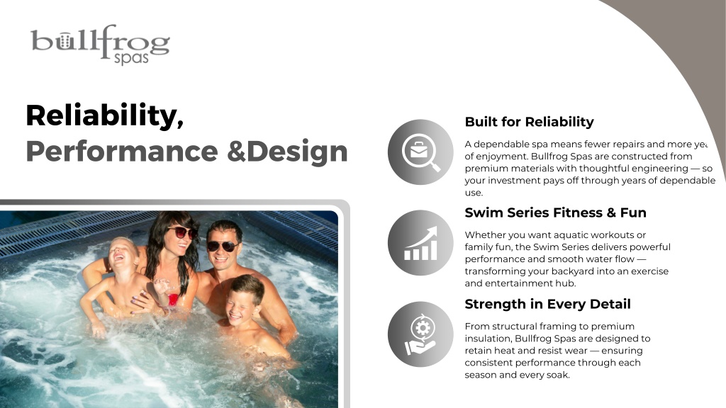 Reliability, Built for Reliability Performance &Design A dependable spa means fewer repairs and more years of enjoyment. Bullfrog Spas are constructed from premium materials with thoughtful engineering — so your investment pays off through years of dependable use. Swim Series Fitness & Fun Whether you want aquatic workouts or family fun, the Swim Series delivers powerful performance and smooth water flow — transforming your backyard into an exercise and entertainment hub. Strength in Every Detail From structural framing to premium insulation, Bullfrog Spas are designed to retain heat and resist wear — ensuring consistent performance through each season and every soak.